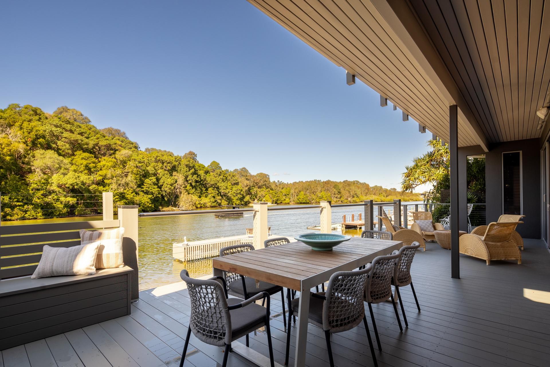 Adjacent to the kitchen, a built-in BBQ and entertaining area make alfresco dining a breeze, while a sandy beach and substantial jetty provide ample space to enjoy the water or moor your luxury watercraft with ease.