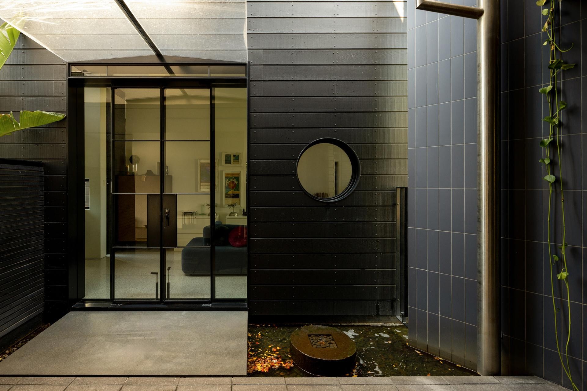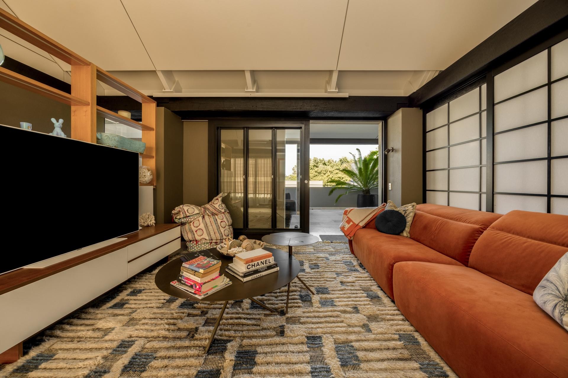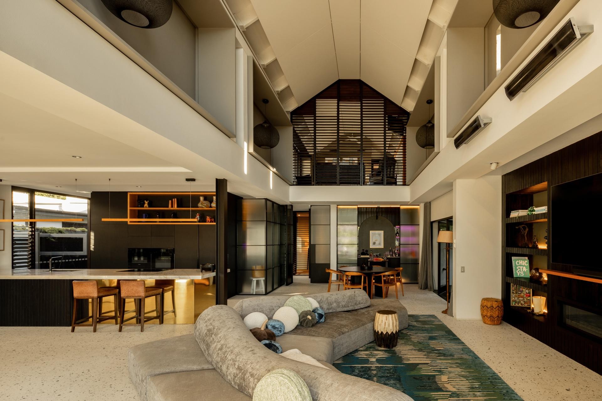 The main living area is framed by commanding granite columns that rise to support black deep-stained ceiling beams, their structural weight balanced by the warmth they bring. Light travels across the north–south roof line, creating a constantly shifting micro climate throughout the day.