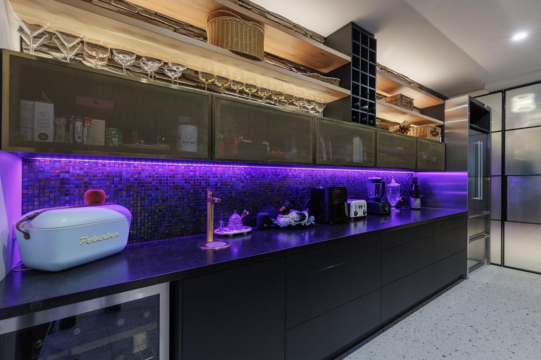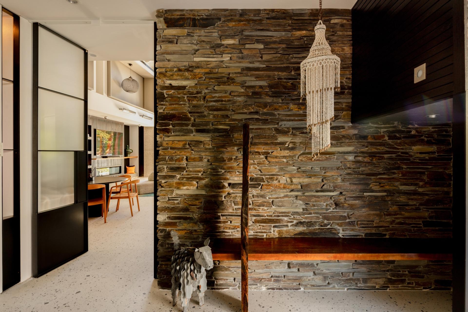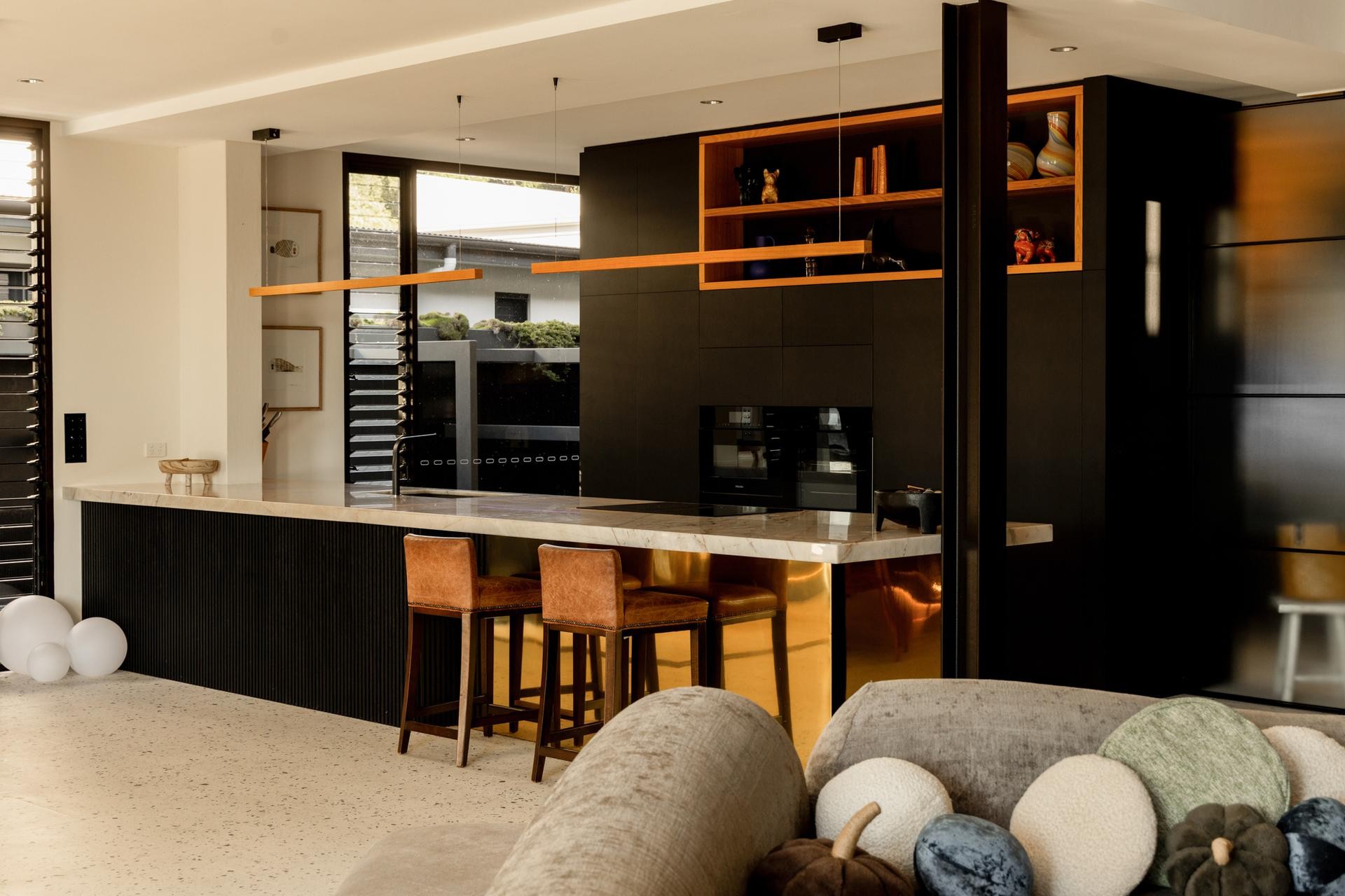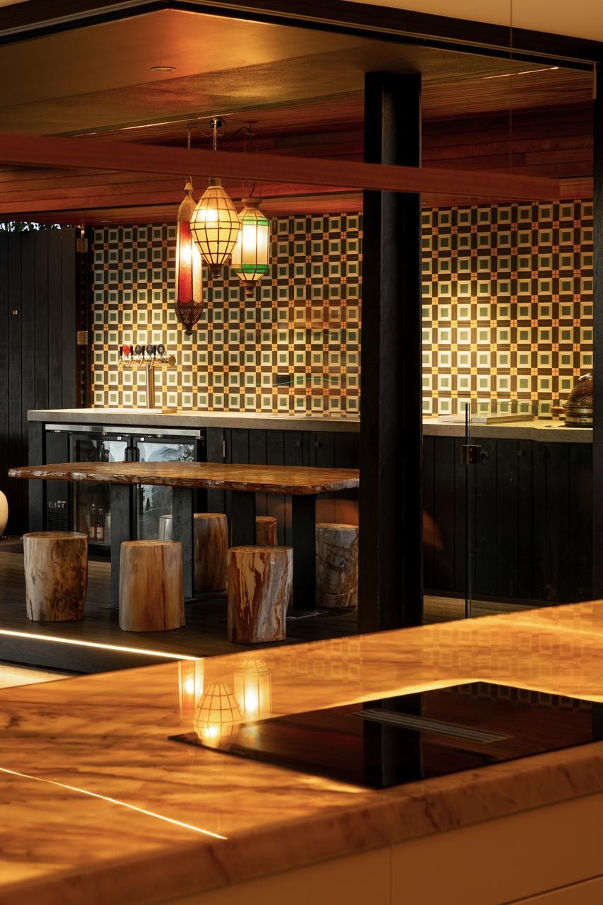 Inside, materials speak in soft confidence: Zurich Brazilian Quartzite bench tops, Ebony and Japan Black timbers, brass cabinetry, glass mosaic splash backs and custom Tasmanian oak timber and stacked slate stone detailing harmonize with sleek black timber veneer kitchen joinery. Premium Meile and Liebherr appliances are fully integrated, with a generous butler's pantry and concealed private bar adding practical luxury to the culinary experience. Every junction, finish and fitting has been designed with precision and purpose.