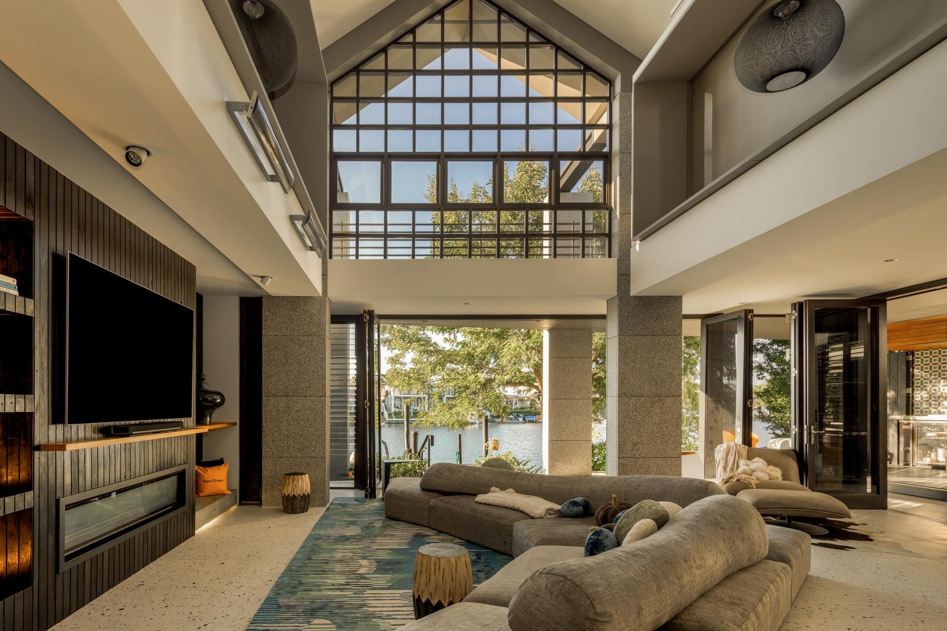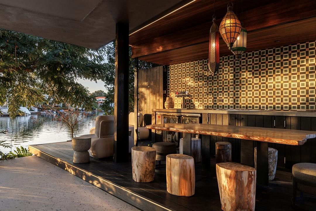 The connection to the water is intrinsic. A private jetty extends the living experience out onto the waterway, bridging architecture and landscape in true Macchia fashion. Entering through a monumental glass sliding door, the home reveals itself gradually through a series of pavilion-like wings. Soaring vaulted ceilings, exposed hardwood beams, and carefully aligned sight lines give the home its open rhythm and enduring calm. These are spaces made for slow living, for beauty, and for presence.