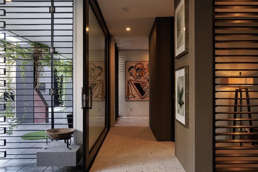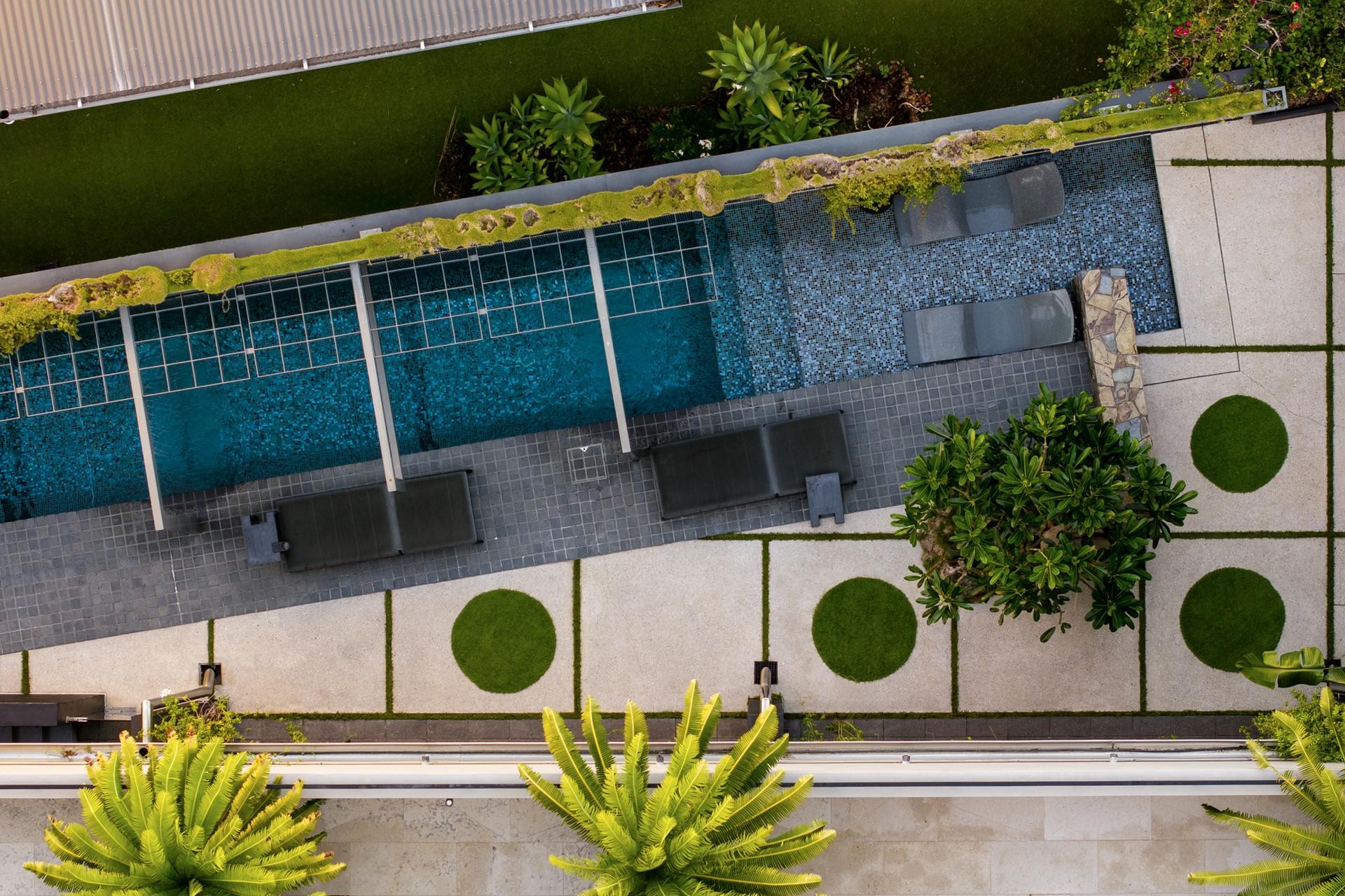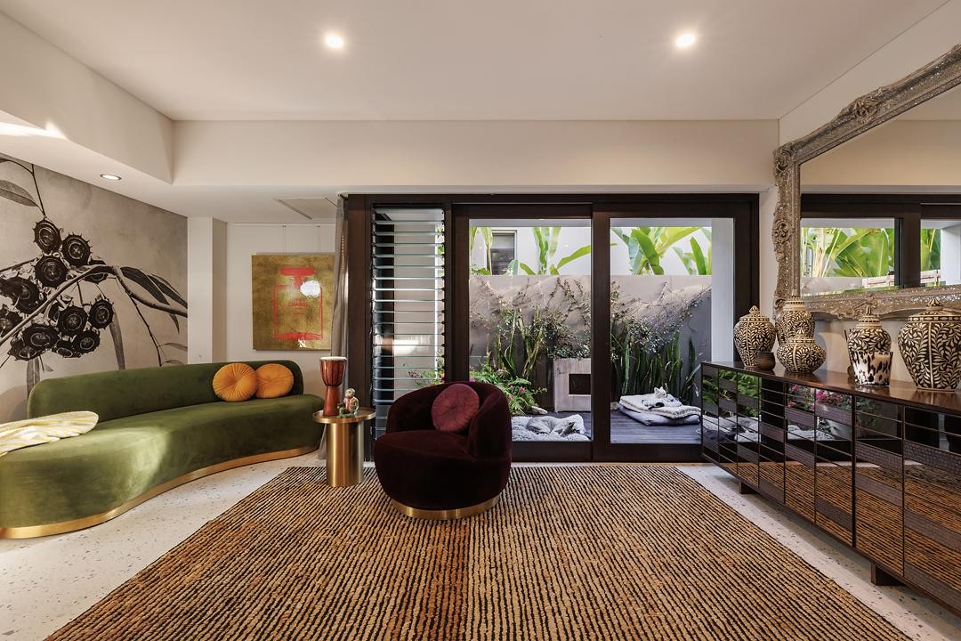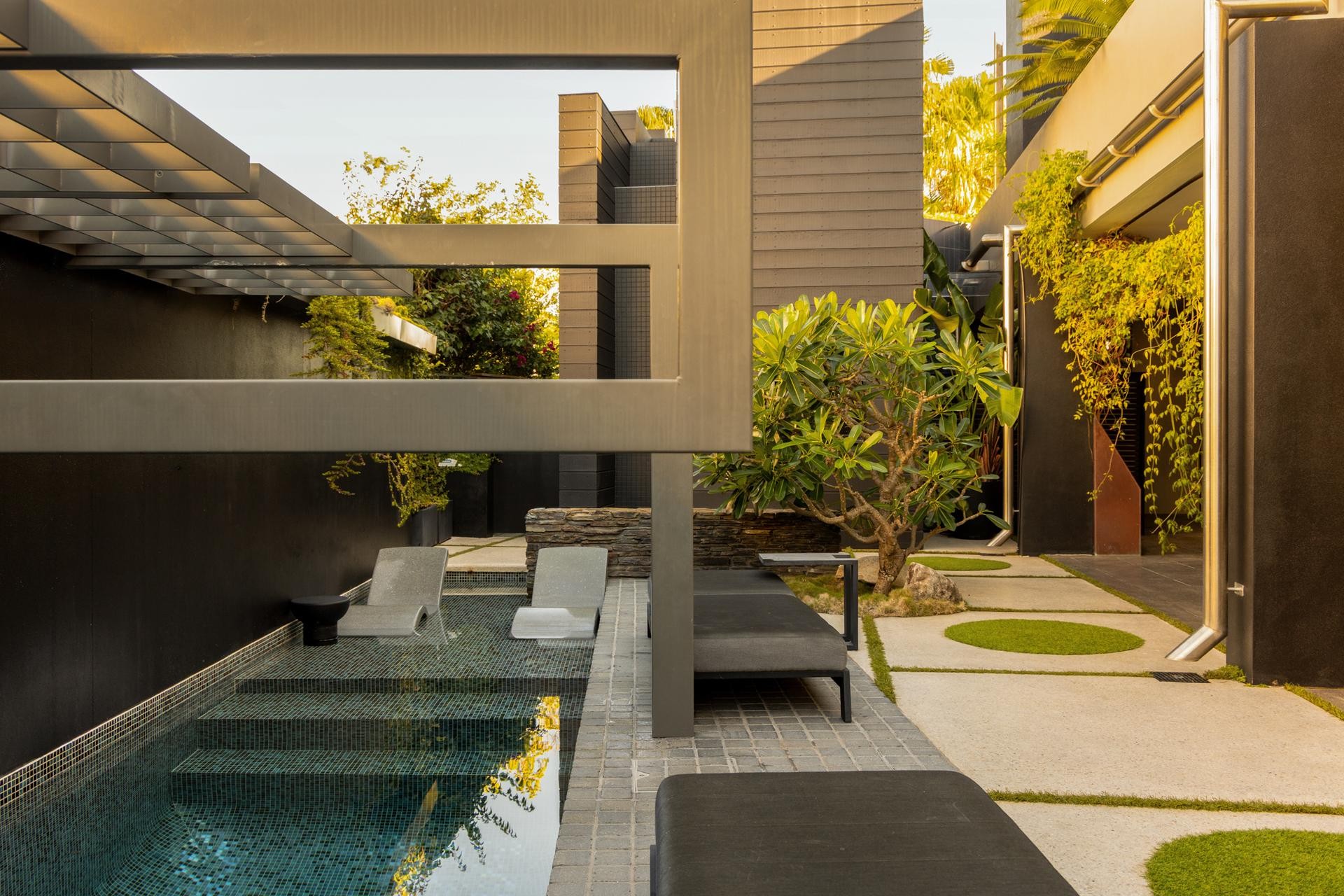 At the heart of the home, a sun-drenched central courtyard becomes a moment of pause-anchoring the layout and drawing natural light deep into the interior. Running alongside, a 25-metre Italian glass mosaic tiled lap pool is framed by architectural structures, cascading waterfalls, and lush sky garden with planting that creates an immersive aquatic journey. Overhead, a fully-roofed entertaining terrace with separate access offers the ideal stage for alfresco dining and large gatherings, elevated to capture cooling breezes and water views in complete privacy.