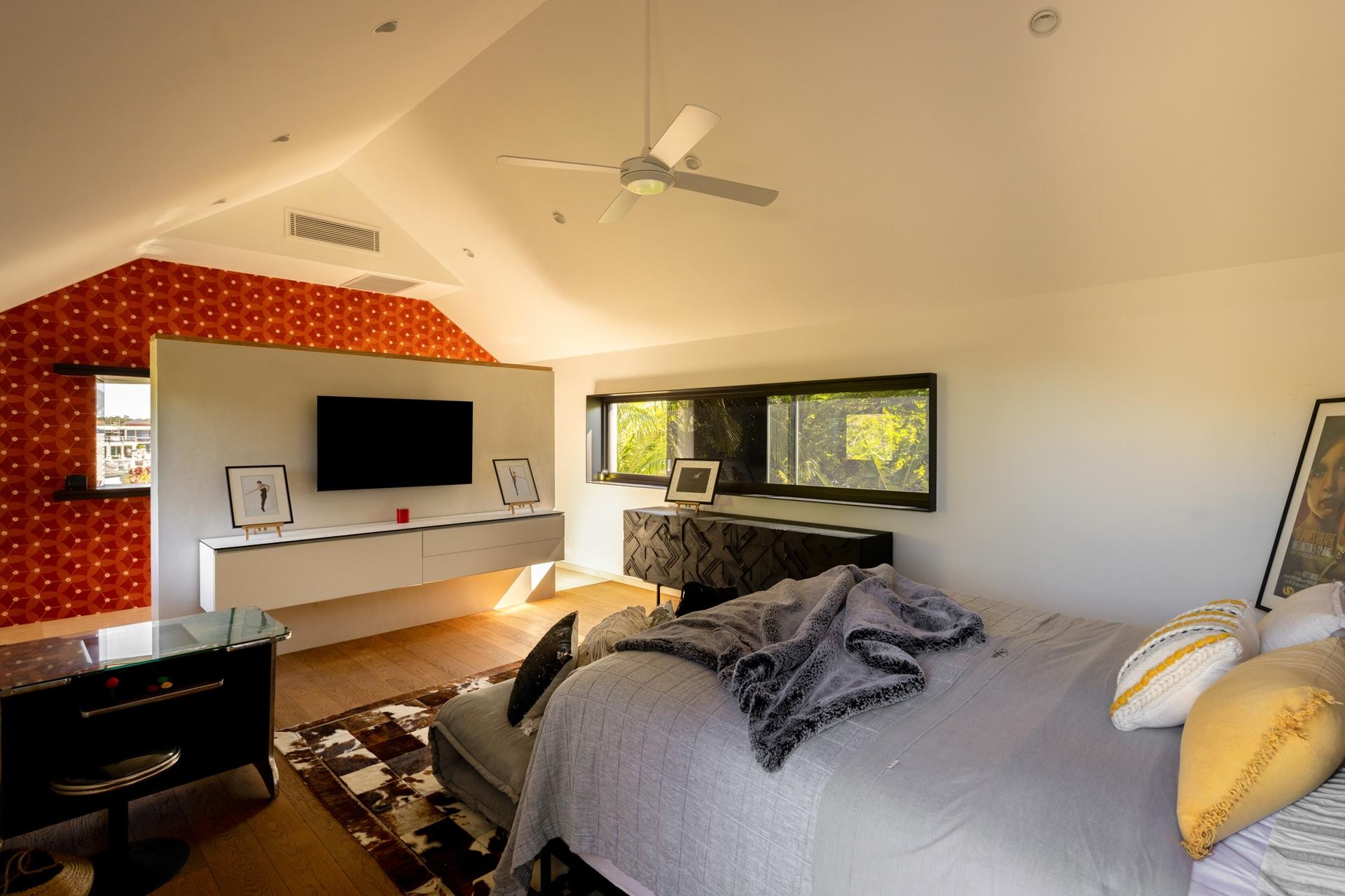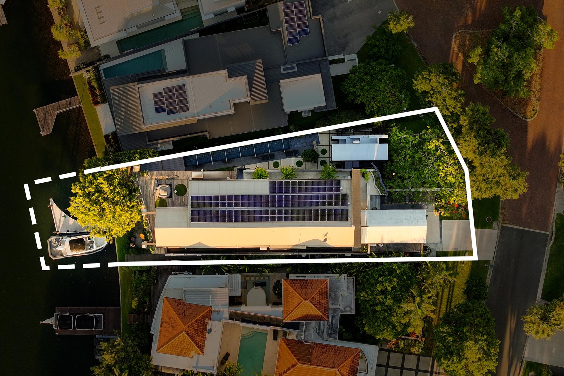 A gated entrance leads to a striking freestanding studio or home office, crowned by a soaring 5-metre vaulted ceiling-its glass façade opening to views across the lap pool and Waterway beyond. Perfectly suited for executive meetings and creative work, this space sets the tone for what lays beyond.