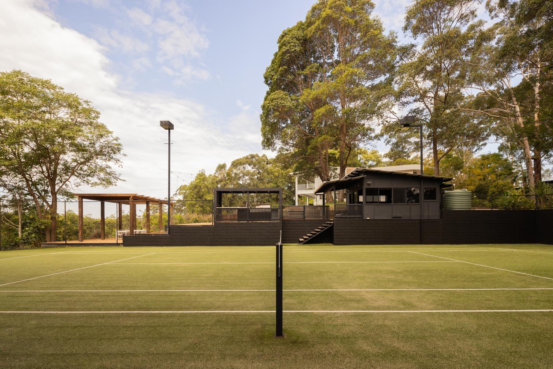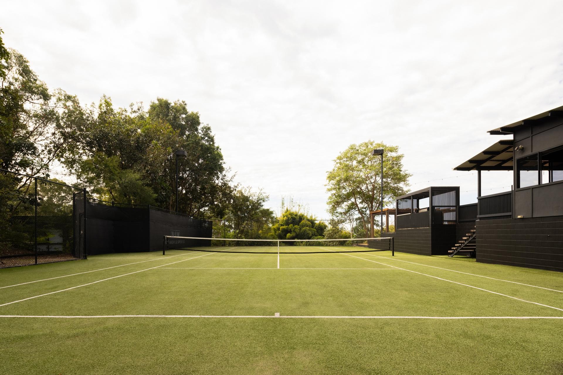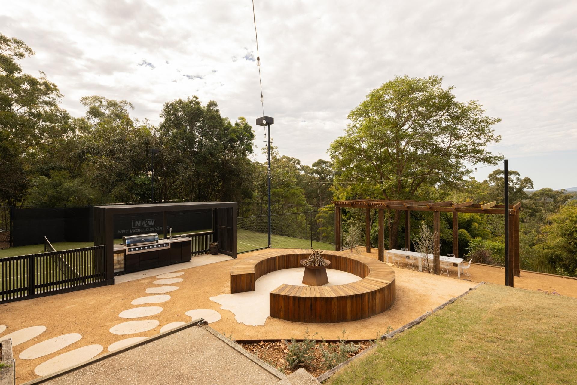 - 18m-long, 2.3m deep, fully resurfaced swimming pool - Expansive lawn separating the residence from external amenities - Timber firepit with curved bench seating and sandstone paving - Full outdoor kitchen and BBQ with oversized timber entertainment arbour - Full-size tennis court with integrated basketball hoop - Standalone yoga studio/wellness retreat with ensuite - Spring-fed dam and productive micro fruit forest (avocados, citrus, bananas, blueberries)