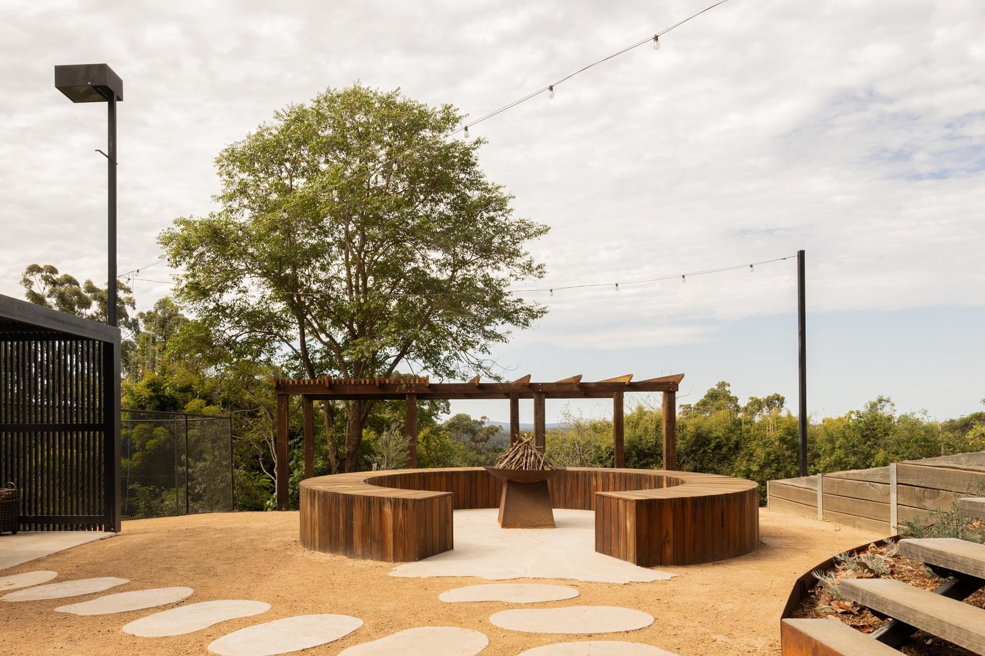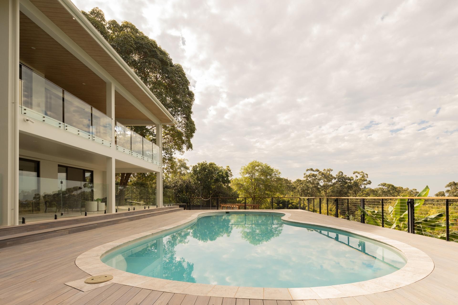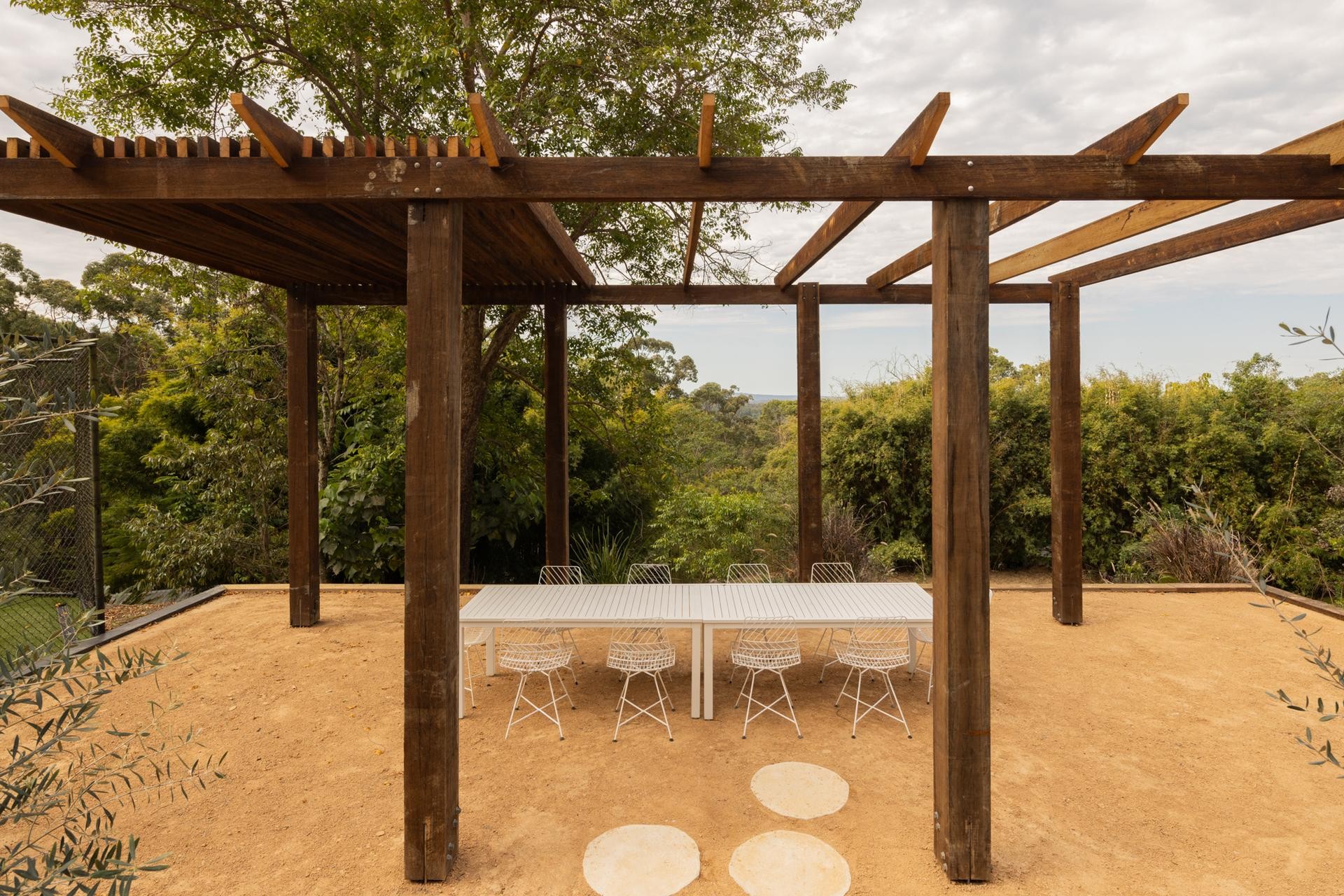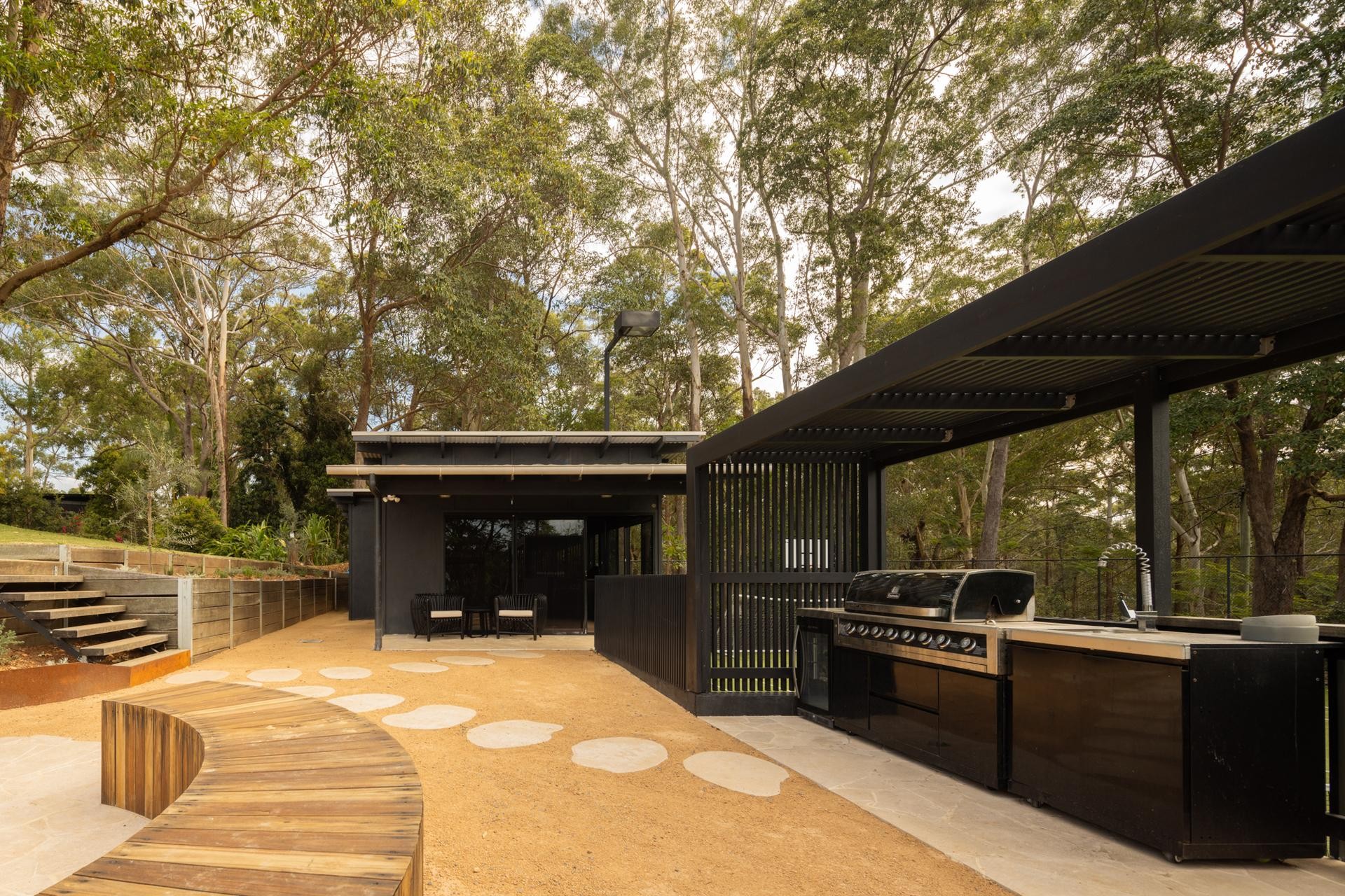 - 18m-long, 2.3m deep, fully resurfaced swimming pool - Expansive lawn separating the residence from external amenities - Timber firepit with curved bench seating and sandstone paving - Full outdoor kitchen and BBQ with oversized timber entertainment arbour - Full-size tennis court with integrated basketball hoop - Standalone yoga studio/wellness retreat with ensuite - Spring-fed dam and productive micro fruit forest (avocados, citrus, bananas, blueberries)