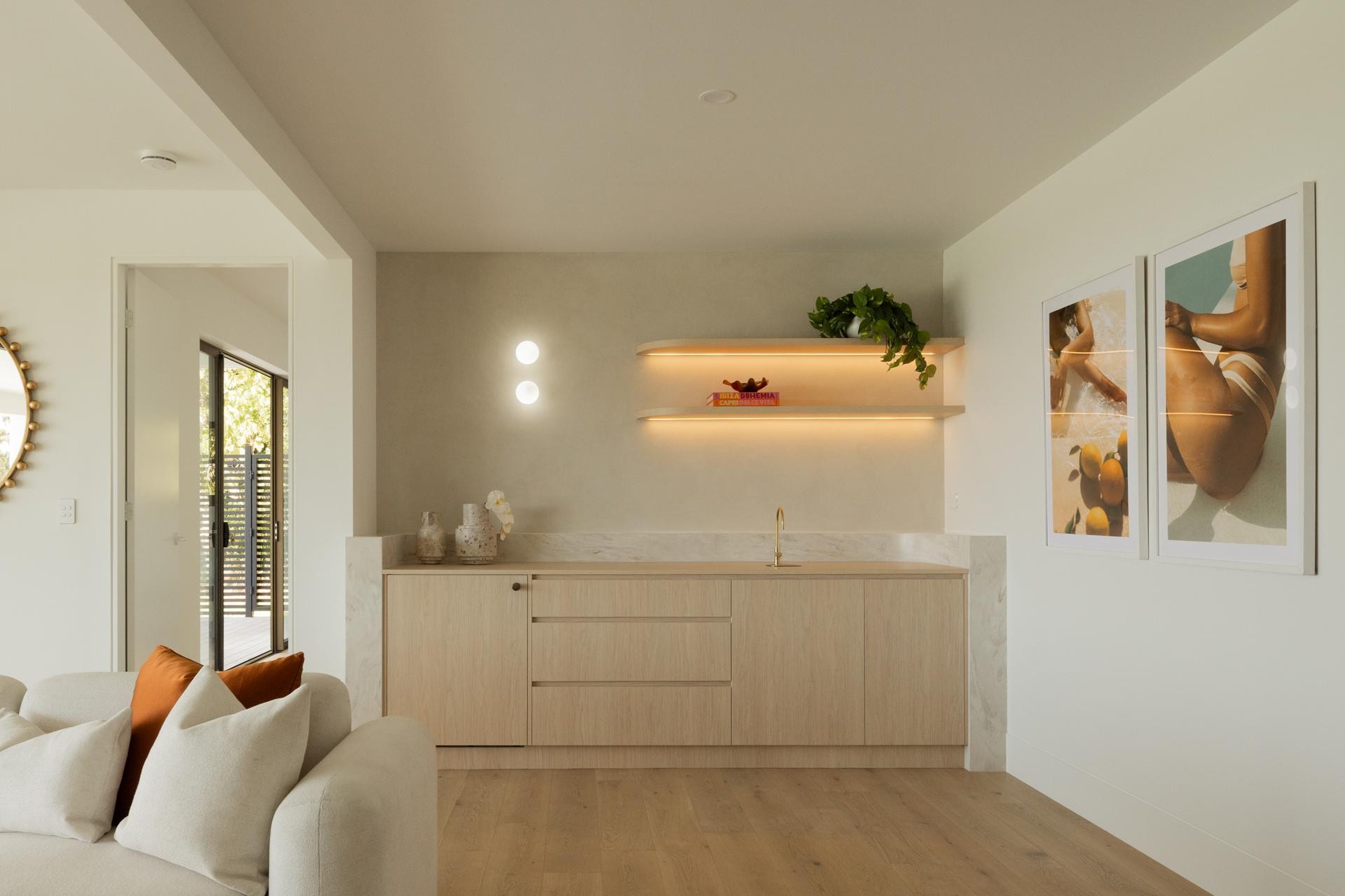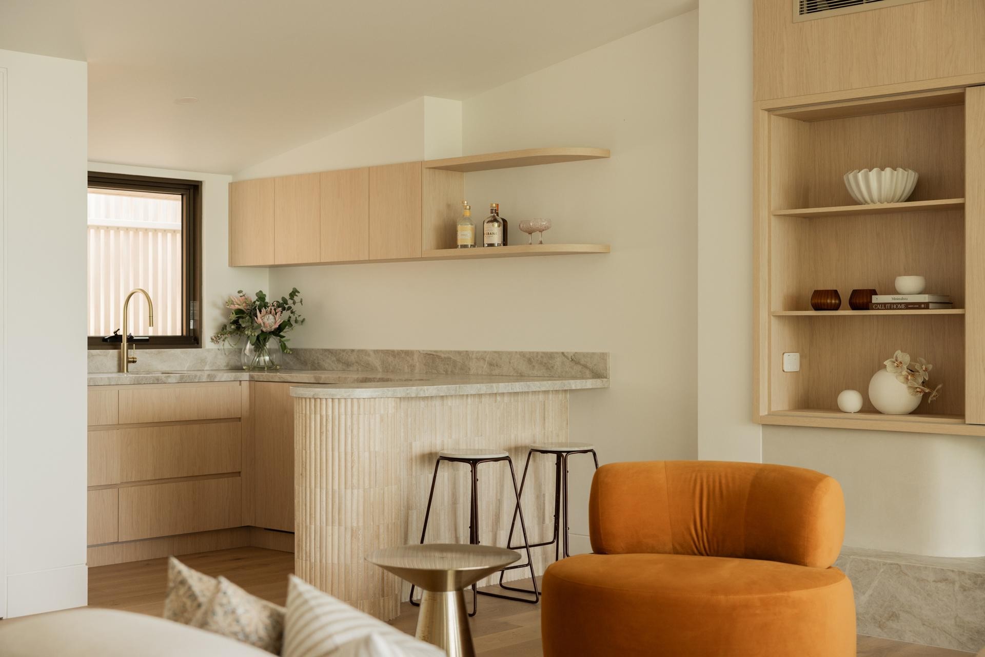 - Grand open-plan living, dining and kitchen with 3.25m Taj Mahal marble island bench - Fully integrated kitchen with butler's pantry and premium appliances - Feature bar with integrated fridges, sink and marble benchtops - Covered alfresco with natural gas BBQ, kitchenette, and overhead exhaust fan - Master suite with travertine ensuite, Taj Mahal marble vanity, and custom walk-in robe - Second bedroom with private ensuite and custom cabinetry - Dedicated soundproofed home office with oak joinery - Powder room with freestanding cement basin