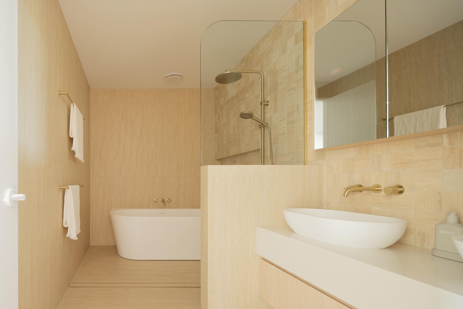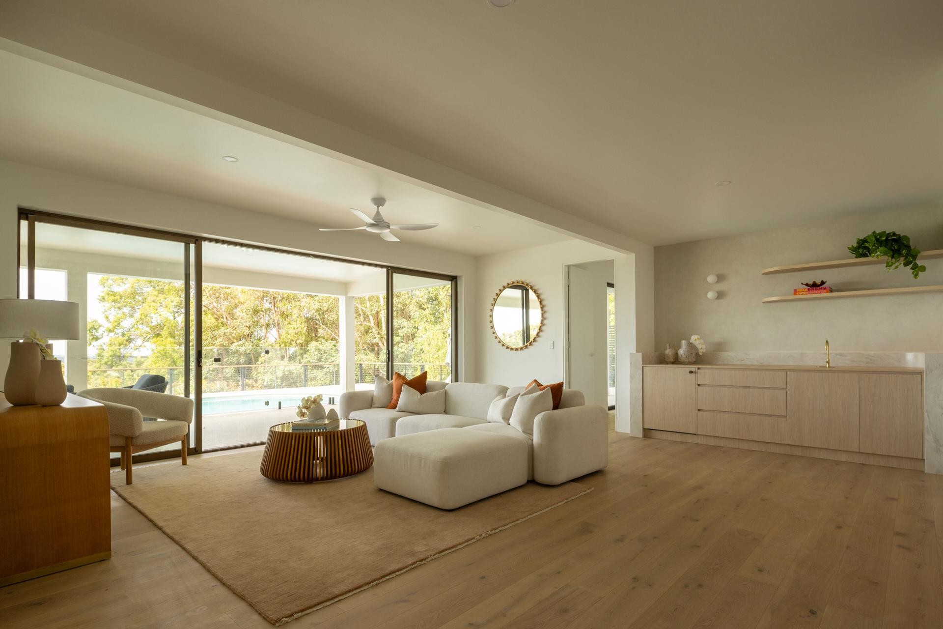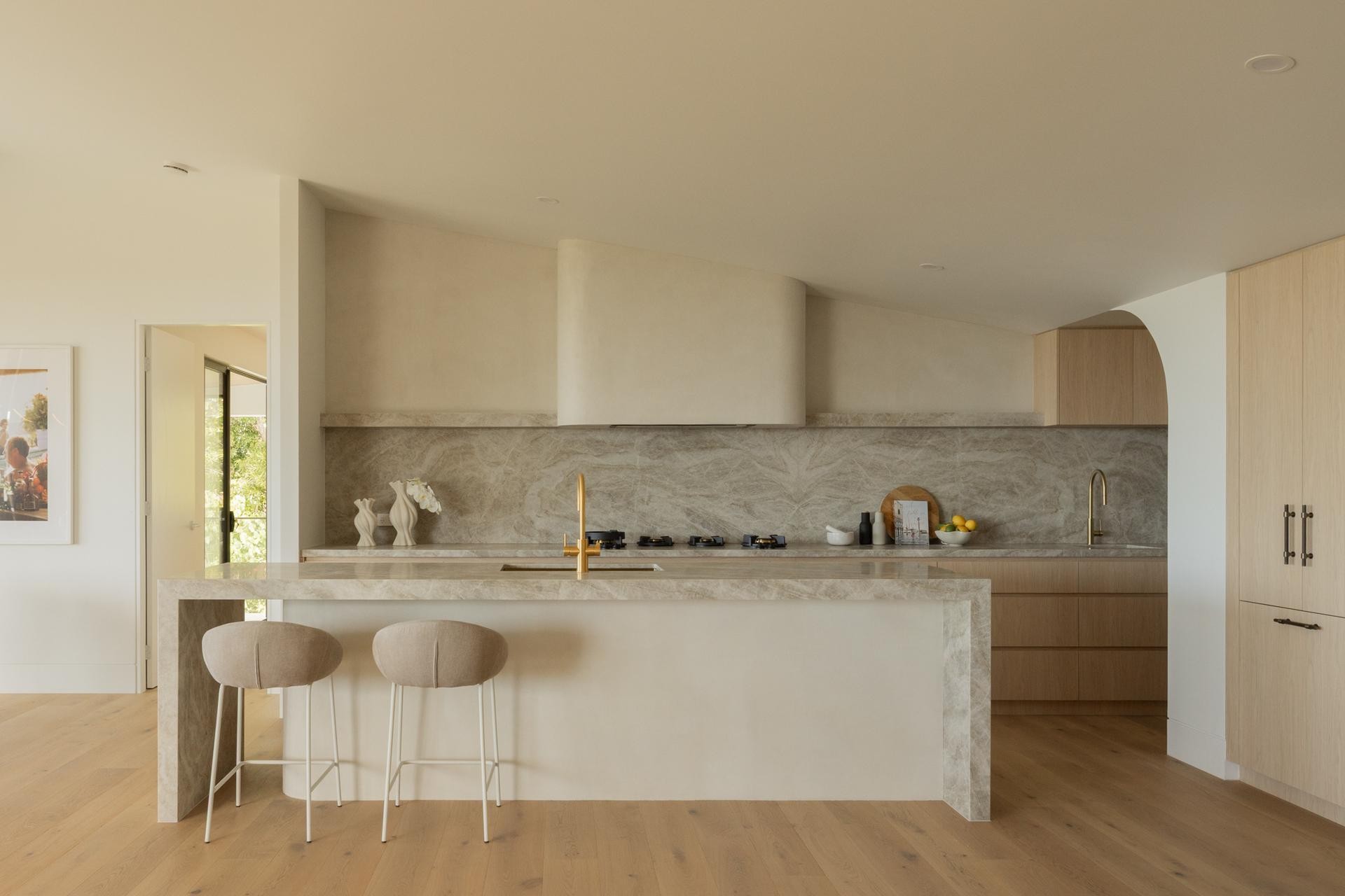 - Taj Mahal marble: kitchen, bar, fireplace, alfresco BBQ area and master ensuite - Travertine floors and walls: bathrooms and alfresco - Santorini White French oak timber flooring throughout - Mineral Fox microcement feature walls - Custom joinery by The Bespoke Joinery Co. - Double-glazed windows